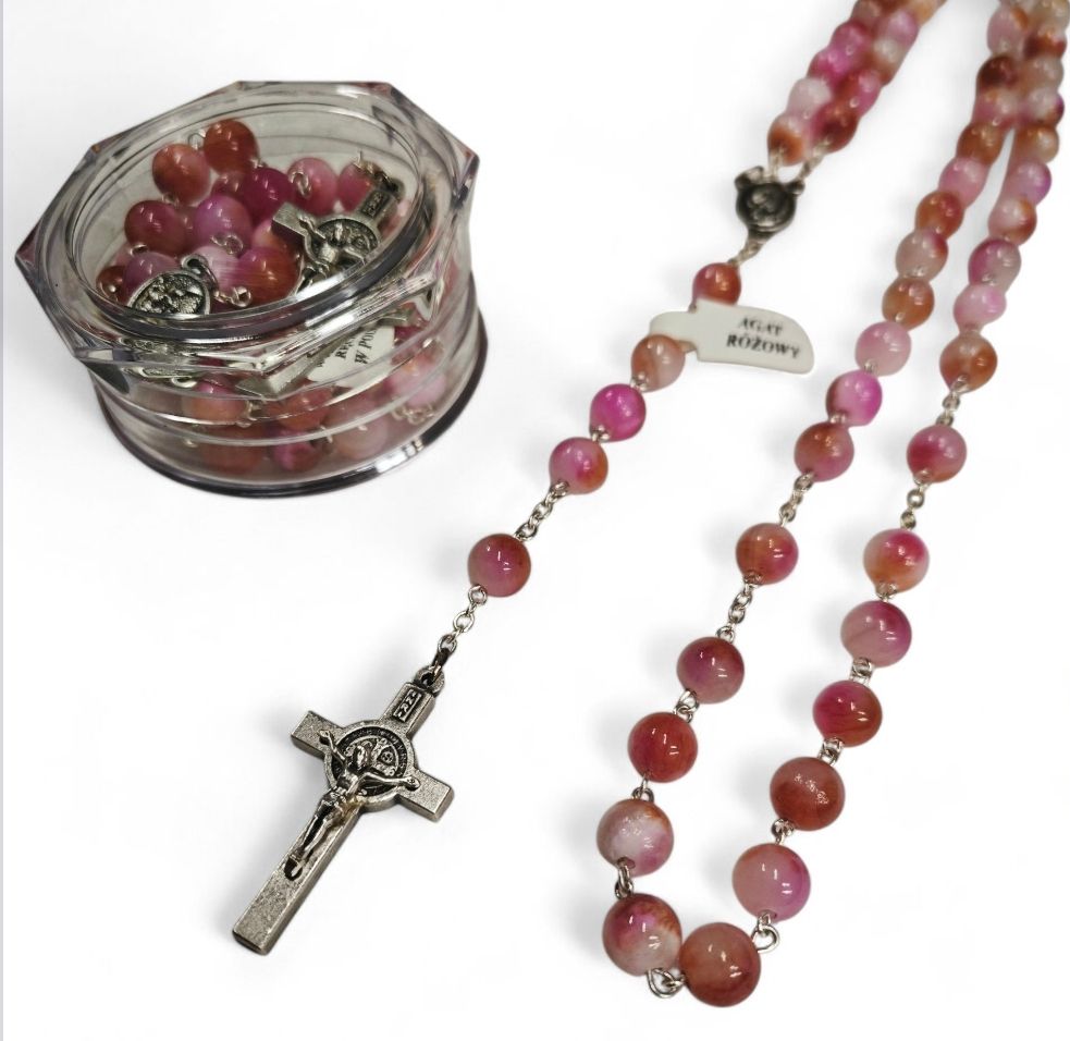 Różaniec pamiątkowy. Kamień naturalny agat różowy łączony metalem.
