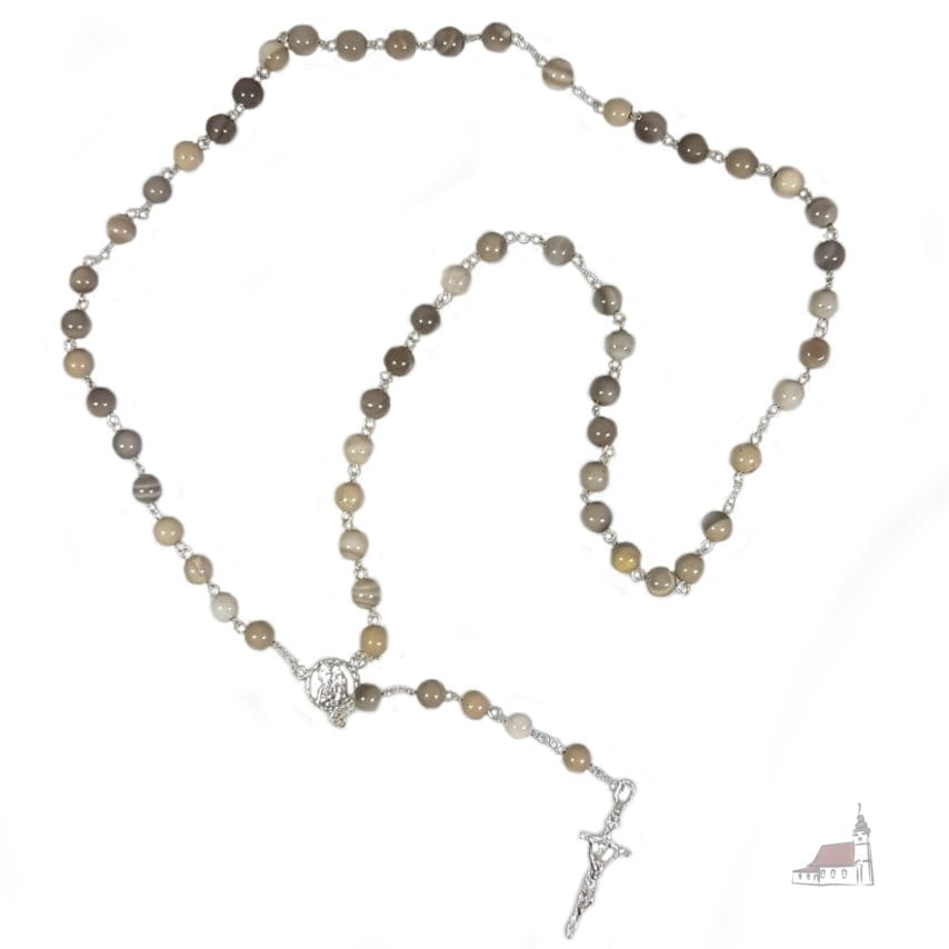 Różaniec z kamienia naturalnego. Krzemień pasiasty. Łączony srebrem