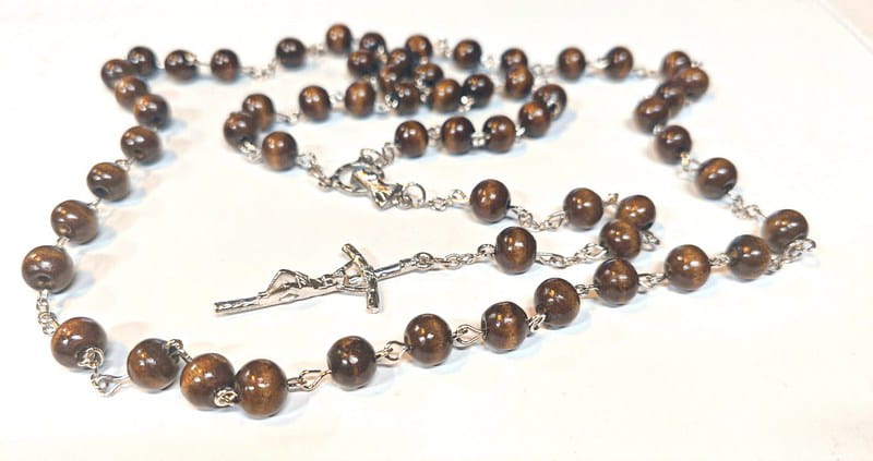Różaniec wykonany z drewna. Łączony metalem. Dwustronny łącznik. Krzyż papieski