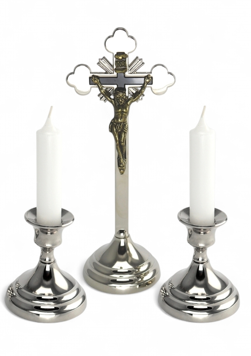 Zestaw kolędowy tradycyjny srebrny - stal nierdzewna krzyż wysoki 22 cm świecznik wysoki