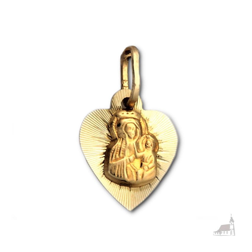Złoty medalik. Matka Boska Częstochowska w sercu. Złoto próby 585