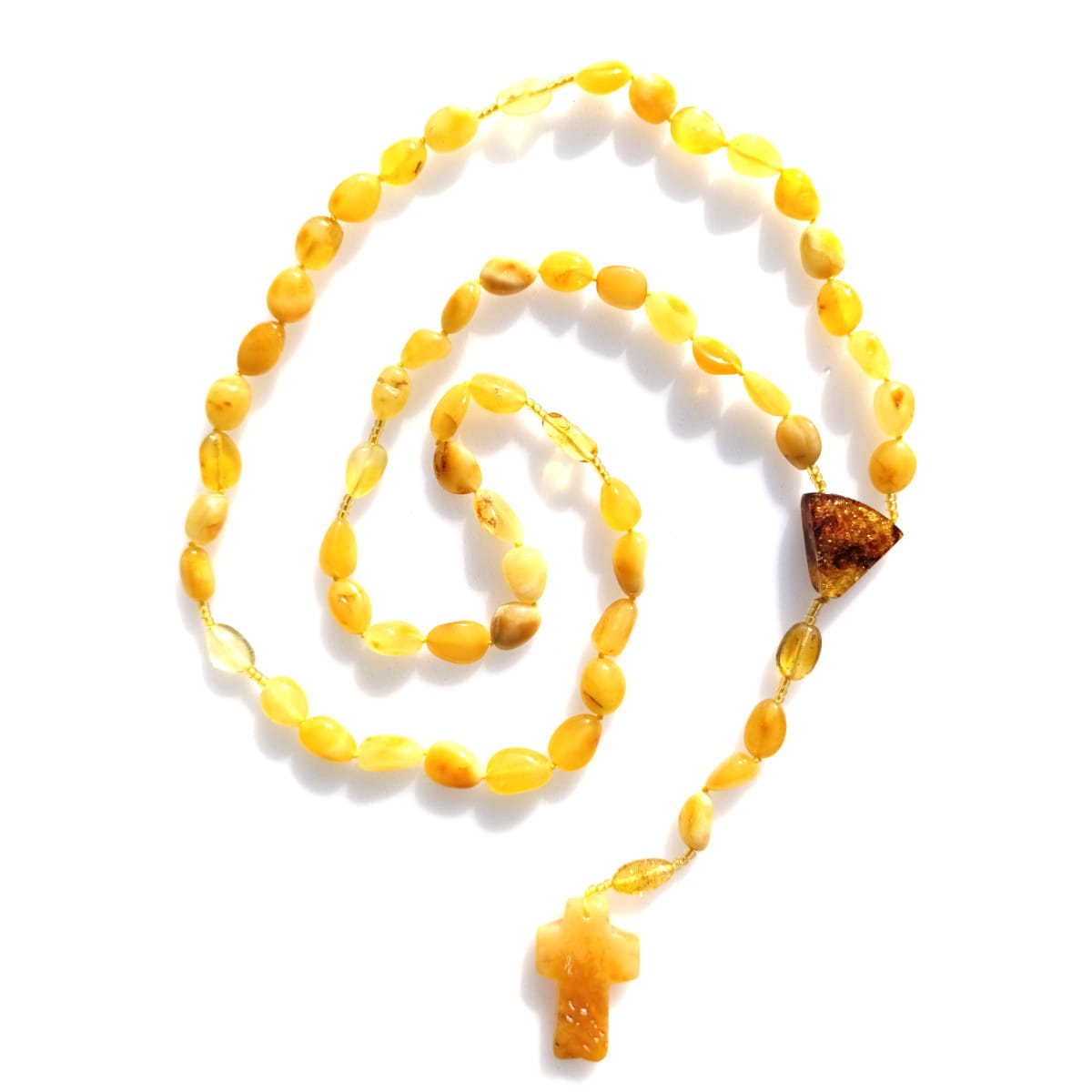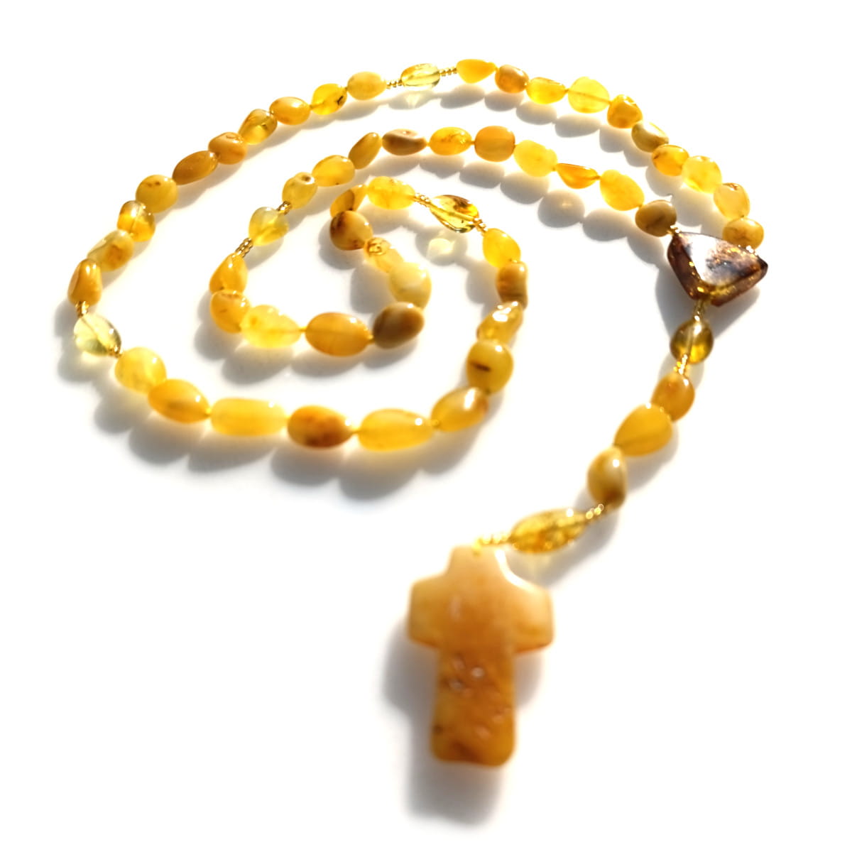 Różaniec z bursztynu łączony sznurkiem. Krzyż Bursztynowy.