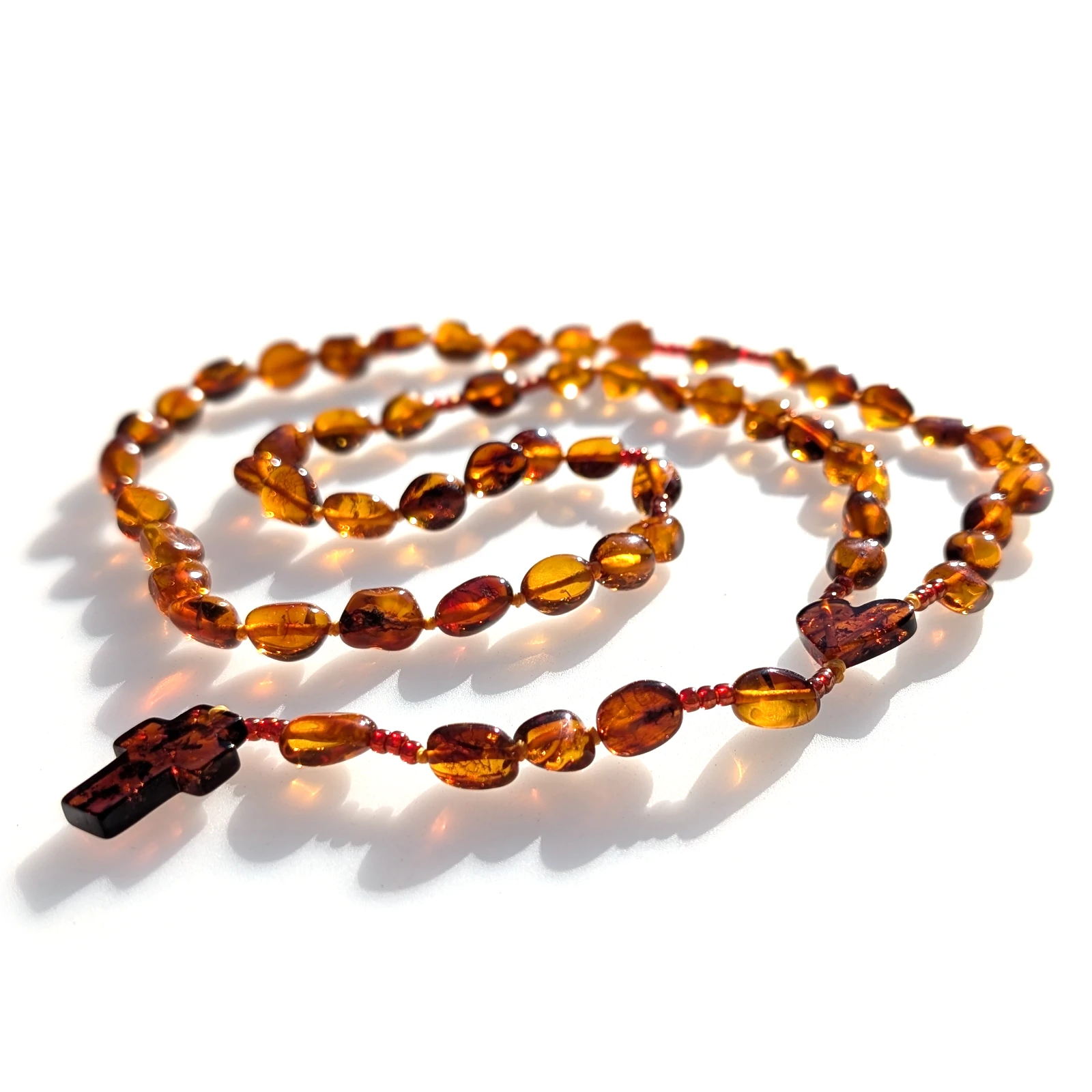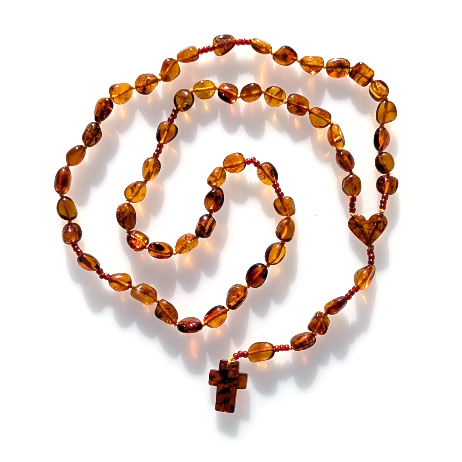 Zastosowanie bursztynu w różańcu gwarantuje niepowtarzalność oraz ciepło jakiego nie uzyskamy stosując kamienie naturalne czy plastik.